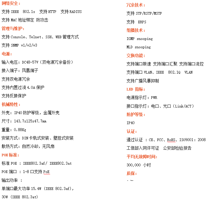 ZXL48GSP-M-SFP是網(wǎng)管型工業(yè)以太網(wǎng)POE交換機(jī),產(chǎn)品符合FCC、CE、RoHS標(biāo)準(zhǔn)。支持4個(gè)千兆光口和8個(gè)千兆電口;支持工業(yè)現(xiàn)場(chǎng)所需的以太網(wǎng)二層協(xié)議,保證通信網(wǎng)絡(luò)的穩(wěn)定性;該系列交換機(jī)采用低功耗、無(wú)風(fēng)扇設(shè)計(jì),確保無(wú)噪聲干擾,同時(shí)支持-40~75℃工作溫度和良好的EMC電磁兼容性能,保證在惡劣的工業(yè)環(huán)境中保持穩(wěn)定的工作,為工廠自動(dòng)化,智能交通,視頻監(jiān)控等工業(yè)應(yīng)用領(lǐng)域組建快速穩(wěn)定的網(wǎng)絡(luò)終端接入網(wǎng)絡(luò)提供安全可靠的解決方案。