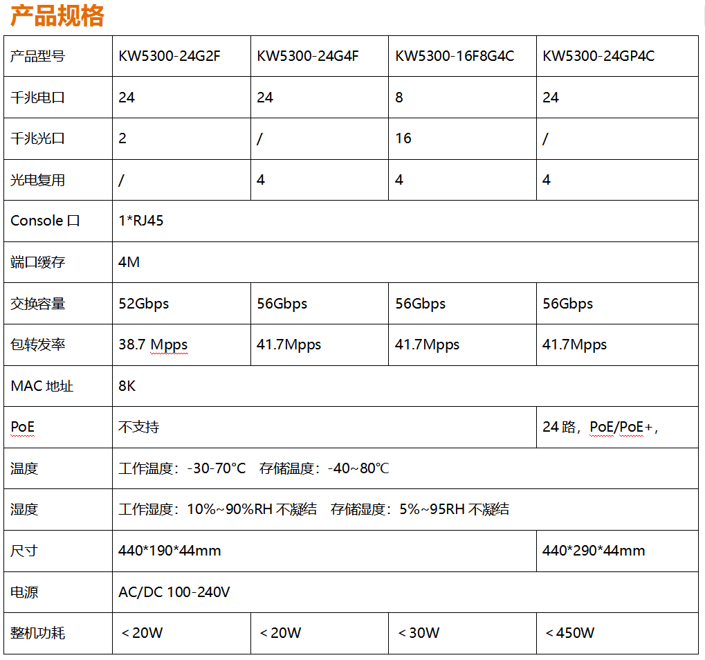 ?全新開發推出的KW5300系列全千兆網管寬溫交換機,采用新一代高性能硬件和軟件平臺,提供靈活、高性價比的全千兆接入和上行端口,支持完備的安全防護機制、完善的ACL/QoS策略和靈活的VLAN功能,易于管理維護,滿足用戶對于網絡設備易管理、高安全、高性能、低成本的組網需求,專為市政、銀行、教育、醫院、酒店、網吧、數據中心等室內項目以及戶外新基建項目定制系列,能滿足大規模的市場需求。