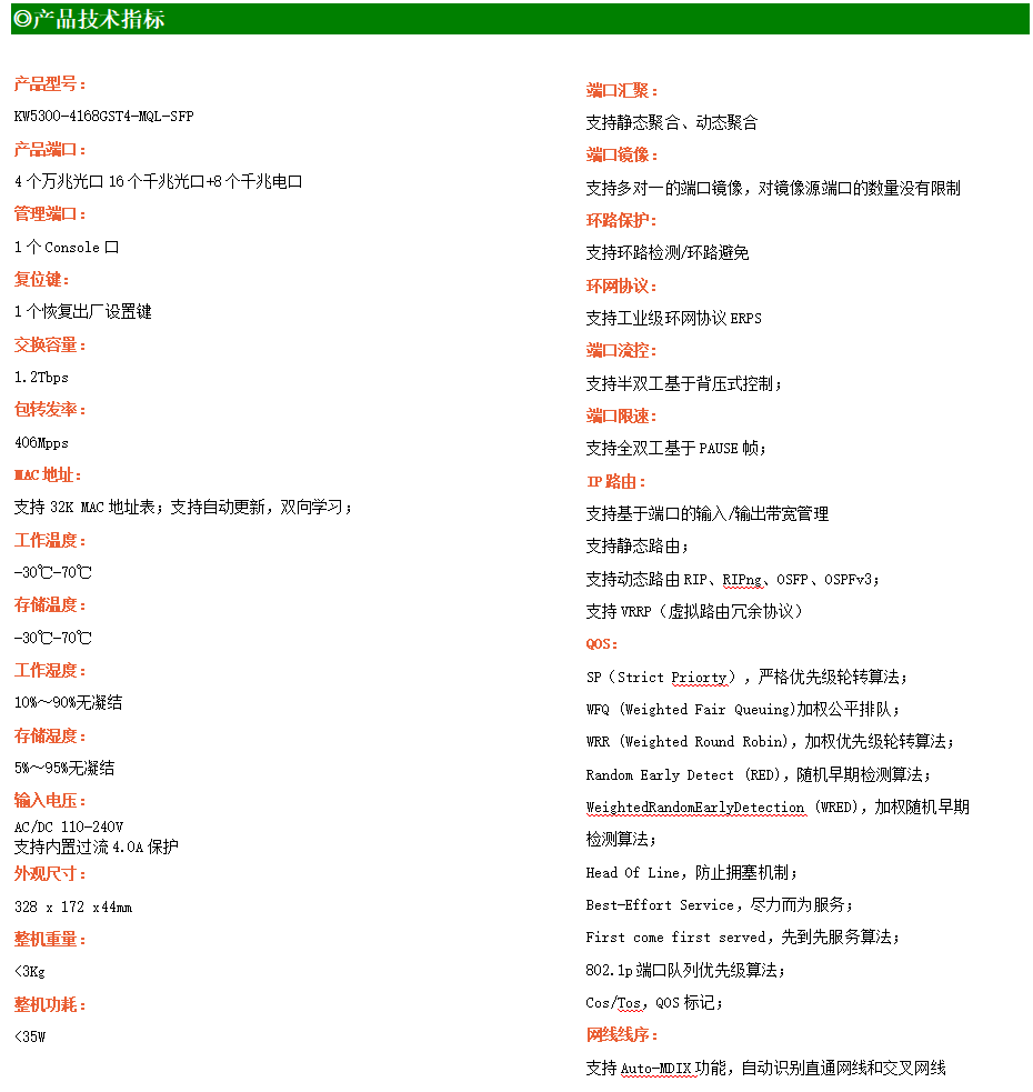 KW5300-4168GST4-MQL-SFP交換機是我司推出的一款萬兆三層交換機,配備4個萬兆SFP+光口、16個千兆SFP光口和8個10/100/1000M Base-T自適應電口,具備先進的硬件處理能力和最豐富的業務特性。支持IPv4/IPv6 硬件雙棧及線速轉發,使客戶能夠從容應對即將帶來的IPv6 時代其提供高容量的交換能力。KW5300-4168GST4-MQL-SFP交換機具有-30℃-70℃的工作溫度,具有超強的堅固度能適應各種嚴苛環境。導軌式安裝特性、寬溫操作,使KW5300-4168GST4-MQL-SFP的交換機成為一個即插即用的工業級設備,為用戶的以太網設備聯網提供可靠、便捷的解決方案。