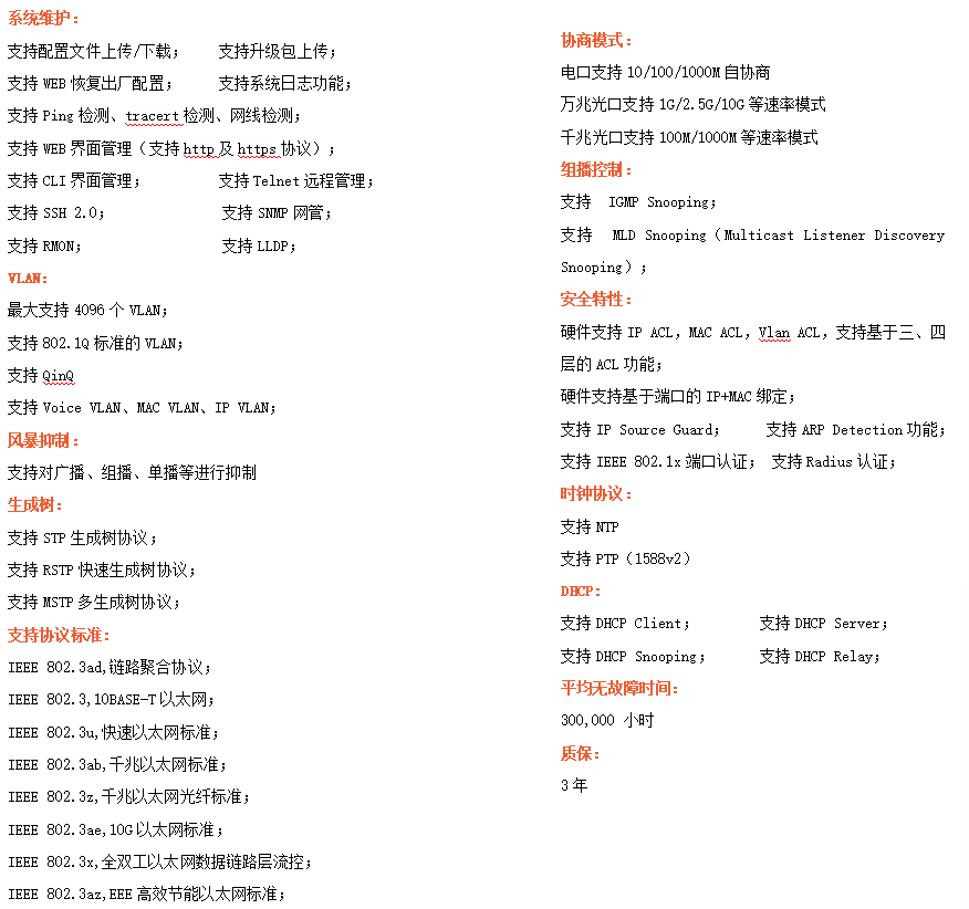 ●網絡冗余:支持STP/RSTP/MSTP,支持ERPS(自愈時間<20ms)