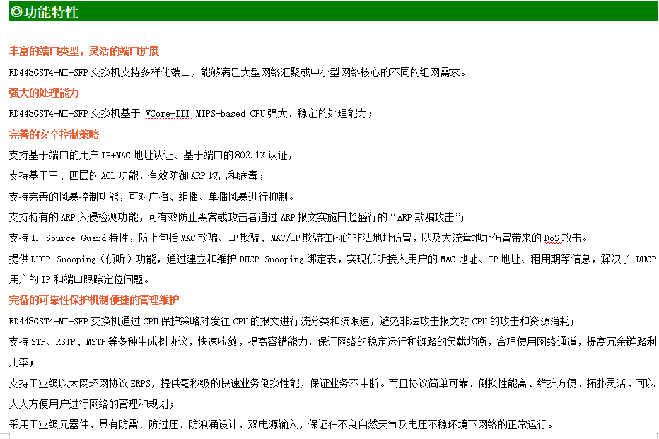 ●網(wǎng)絡(luò)冗余:支持STP/RSTP/MSTP,支持ERPS(自愈時間<20ms)